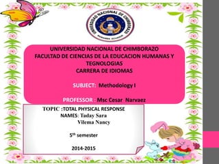 This document discusses the Total Physical Response (TPR) language teaching method. TPR attempts to teach language through physical activity by having learners act out commands given by the teacher. The objectives of TPR are to teach oral proficiency at a beginning level through comprehension exercises that ultimately aim to develop basic speaking skills. Some advantages of TPR include that it is fun, memorable, and good for kinesthetic learners, while disadvantages include that it does not practice pronunciation or speaking and lacks creativity. The document outlines appropriate applications of TPR in the classroom and the primary roles of both learners and teachers in a TPR-based lesson.