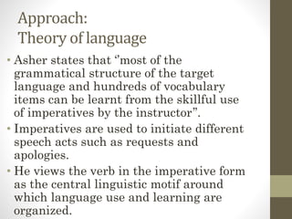 Total Physical Response (TPR) is a language teaching method developed by James Asher that uses physical movements and actions to help teach language. In TPR, the instructor uses imperative verbs to initiate actions by students to help them learn vocabulary and grammar without pressure. Asher believes that through coordinated speech and physical response to commands, students can learn language in a low-anxiety way that mirrors how children acquire their first language. TPR aims to develop basic oral proficiency through comprehension before speaking.