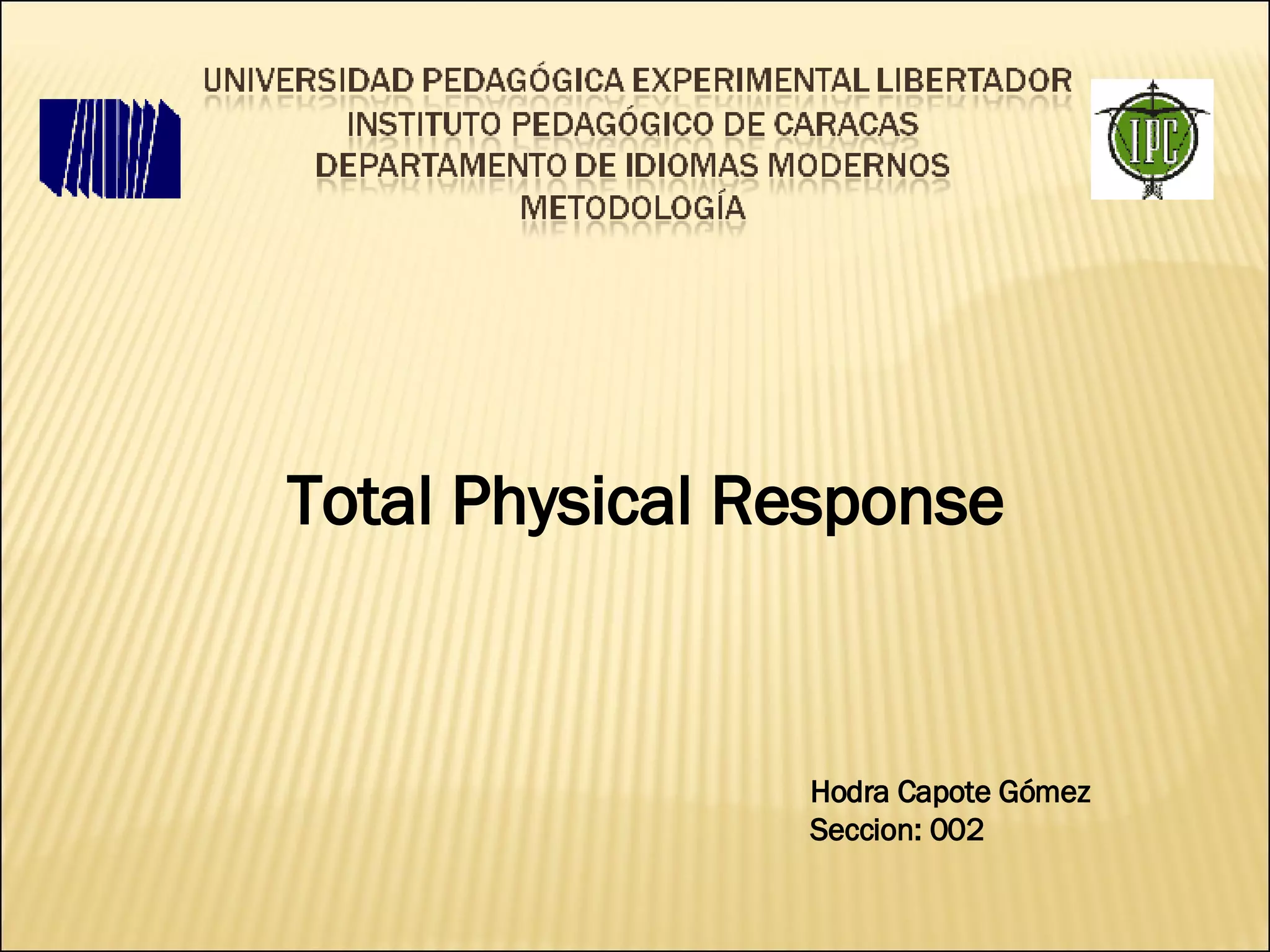 Total Physical Response (TPR) is a language teaching method developed by James Asher that uses physical movement and actions to help students learn a language. It is based on three principles: understanding spoken language should develop before speaking; understanding evolves through student body movement; and students should not be forced to speak but will speak spontaneously. TPR aims to teach oral proficiency at beginning levels through comprehension and action-based drills in the imperative form. While flexible, it may not be suitable for all learners and teachers need training to implement it effectively.
