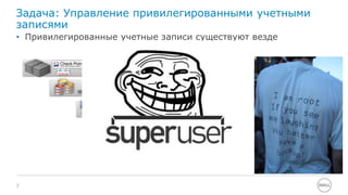 Документ обсуждает управление привилегированными учетными записями и паролями, включая их аудит и контроль через специализированные программные и аппаратные модули. Подчеркиваются задачи по безопасности, эффективности и индивидуальной ответственности в управлении доступом к системам. Также рассматриваются проблемы, связанные с встраиванием паролей в код приложений и необходимостью ведения аудита сессий для соответствия стандартам.