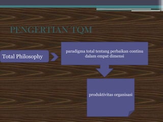 Dokumen ini membahas Total Quality Management (TQM) sebagai pendekatan manajemen yang berfokus pada perbaikan berkelanjutan dalam organisasi untuk meningkatkan kualitas produk dan layanan serta kepuasan pelanggan. TQM melibatkan seluruh anggota organisasi dan memerlukan komitmen serta pelatihan untuk mencapai tujuan efektivitas dan produktivitas. Selain itu, peran pemimpin dan pekerja sangat penting dalam implementasi TQM, dengan survei sikap karyawan yang membantu memahami pandangan mereka terhadap perusahaan.