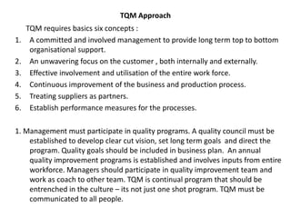 Total Quality Management (TQM) is both a philosophy and set of principles for continuously improving an organization. It integrates management techniques, improvement efforts, and tools to exceed customer needs now and in the future. TQM requires focusing on customers, involving all employees, continuously improving processes, treating suppliers as partners, and establishing performance measures. When implemented properly with management commitment, training, and an emphasis on culture change, TQM can lead to benefits like improved quality, customer satisfaction, productivity, and profitability. However, obstacles like lack of planning, resistance to change, and failure to continuously improve can undermine TQM efforts.