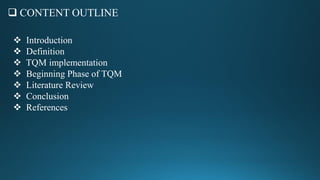 Total Quality Management (TQM) is a comprehensive management approach aimed at continuous improvement and customer satisfaction, evolving from earlier quality control practices since the 1920s. Effective implementation of TQM requires collaboration across all organizational levels, focusing on planning, execution, evaluation, and standardization of processes. Research and case studies indicate that TQM positively impacts product quality and innovation in various industries, emphasizing its relevance across different organizational contexts.