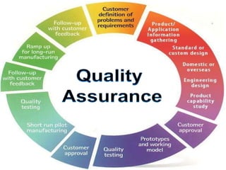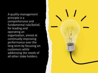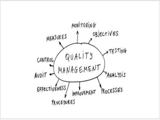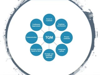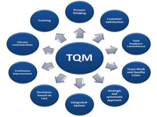 The document outlines the importance of total quality management (TQM) and its impact on organizational success, emphasizing that quality will determine a company's future. It discusses key concepts, principles, and historical figures in quality management, including contributions from Deming and Juran, and contrasts quality control with quality assurance. Additionally, it highlights the benefits of TQM, such as improved profitability, customer satisfaction, and employee morale.