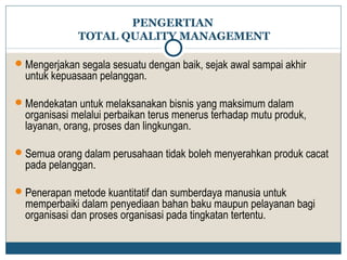 Dokumen ini membahas konsep Total Quality Management (TQM) yang berfokus pada perbaikan terus-menerus untuk meningkatkan mutu produk dan layanan sambil memastikan kepuasan pelanggan. TQM melibatkan seluruh anggota organisasi dalam upaya meningkatkan kualitas dan membutuhkan komitmen manajemen serta keterlibatan karyawan. Terdapat juga penekanan pada perubahan budaya organisasi dan perlunya komunikasi yang efektif untuk mencapai keberhasilan dalam penerapan TQM.