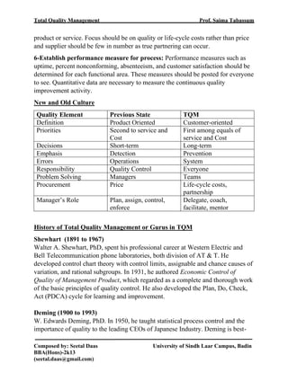 This document provides an introduction and overview of Total Quality Management (TQM). It discusses the basic concepts of TQM including management commitment, customer focus, employee involvement, continuous process improvement, supplier partnerships, and performance measurement. It also summarizes the contributions and philosophies of quality gurus like Deming, Juran, Crosby, Ishikawa and Taguchi. Finally, it outlines some common obstacles to implementing a TQM system and provides a chapter-by-chapter outline of topics to be covered.