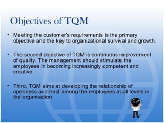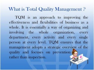 Total Quality Management (TQM) is a management philosophy focused on meeting customer needs and organizational objectives through integrating all organizational functions. TQM involves everyone in the organization and focuses on continuously improving service quality. Key elements of TQM include management commitment, employee empowerment, fact-based decision making, and continuous improvement with a focus on customer satisfaction. Quality management tools like checklists, Pareto charts, histograms, and control charts are used to identify problems, prioritize issues, and track quality improvements.