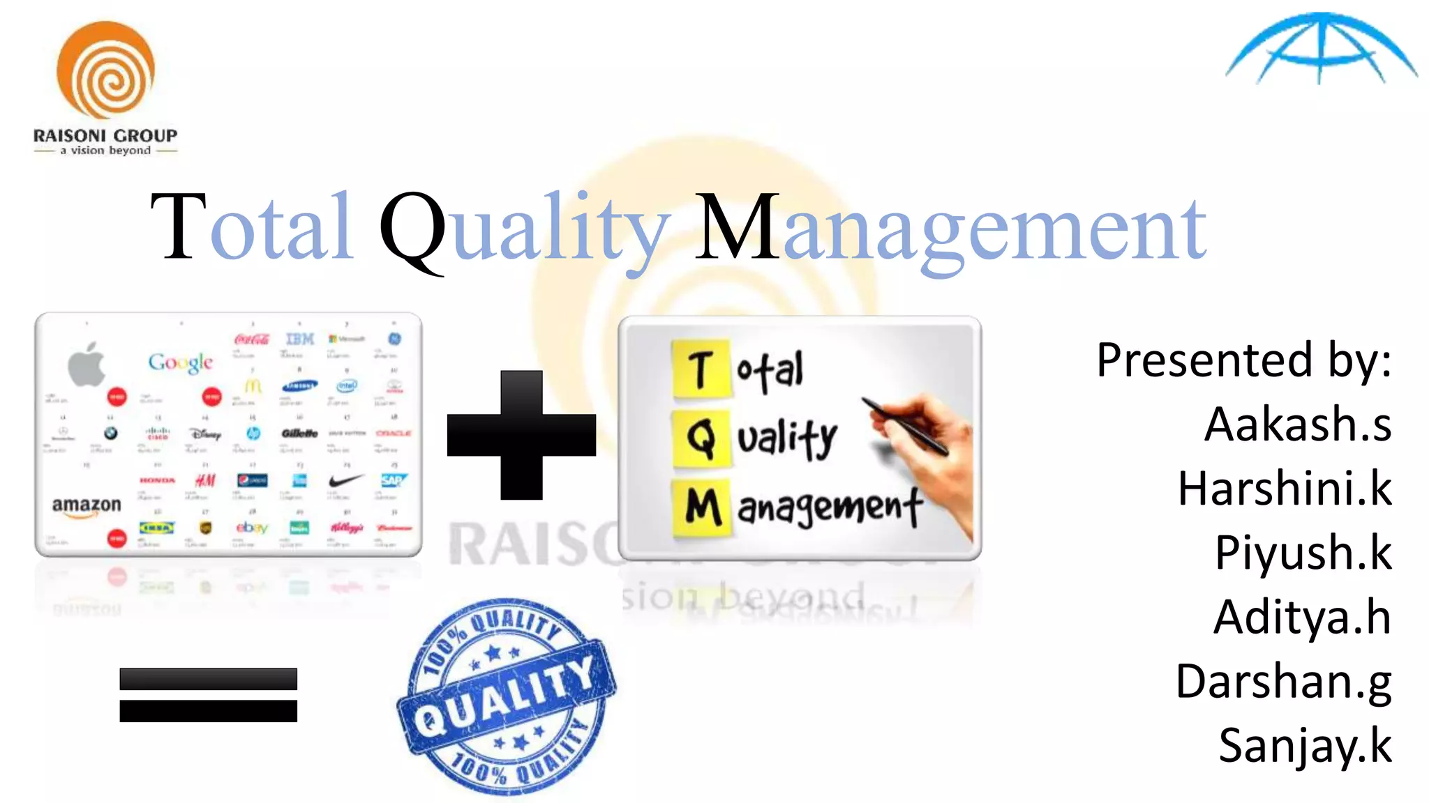 Total Quality Management (TQM) is defined as an integrated organizational effort to improve quality at every level. It involves the whole organization managing all processes to achieve excellence and prevent errors. Key features of TQM include closer customer relations, increased training, employee empowerment, quality monitoring, and consumer views. Some advantages are enhanced market image, reduced costs, improved customer satisfaction and employee morale. TQM implementation takes years and requires significant management and staff time.