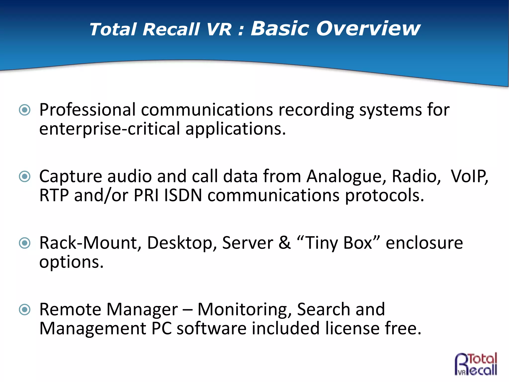 This document provides information on the Total Recall VR professional audio logging and call recording system. It offers rack-mount, desktop, server, and compact enclosure options to capture audio from analog, radio, VoIP, RTP and ISDN sources. The system includes remote manager software for monitoring, searching and managing recorded calls from any PC. It provides reliable, secure and powerful recording capabilities in an affordable and flexible platform.