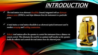 The document summarizes the principles and working of a total station. It describes a total station as an electronic theodolite integrated with an electronic distance meter that can measure slope distances. It discusses the parts of a total station and how they work using polar coordinates to determine a point's position through angle and distance measurements. The document outlines the advantages of total stations in allowing quick data collection and layout for construction sites. It also notes some disadvantages like less accurate vertical measurements compared to traditional surveying methods.
