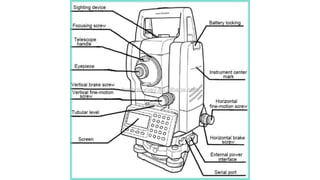 The total station is an electronic surveying instrument that can measure both horizontal and vertical angles as well as distances to targets. It uses a microprocessor to control angle and distance measurements and perform calculations. Measurements are made by sending an electromagnetic beam to a prism reflector and measuring the phase difference between the outgoing and returning signals. The total station is used for topographic surveys, construction layout, and other applications where precise angular and distance measurements are needed.