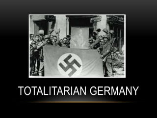 Germany was devastated after WWI and further damaged by reparations payments. During the Great Depression, Adolf Hitler rose to power modeling his Nazi party after Italian Fascism. He imprisoned those who opposed him and wrote Mein Kampf, outlining his desire to create a powerful Germany and claims of Aryan supremacy. As the Depression continued and the Nazi party grew in popularity, Hitler was appointed chancellor of Germany in 1932 where he established a secret police, outlawed other parties, and censored information to increase his totalitarian control over Germany.