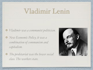 This document discusses several totalitarian leaders throughout history including Vladimir Lenin, Stalin, Mao Zedong, and Hitler. Lenin introduced a mixed economy model in the Soviet Union combining aspects of communism and capitalism. Stalin carried out purges of enemies and implemented 5-year economic plans. Mao Zedong killed political threats in China and caused the deaths of millions during the Great Leap Forward and Cultural Revolution. Hitler wrote Mein Kampf in prison and used the Reichstag fire to consolidate power as the leader of Nazi Germany.