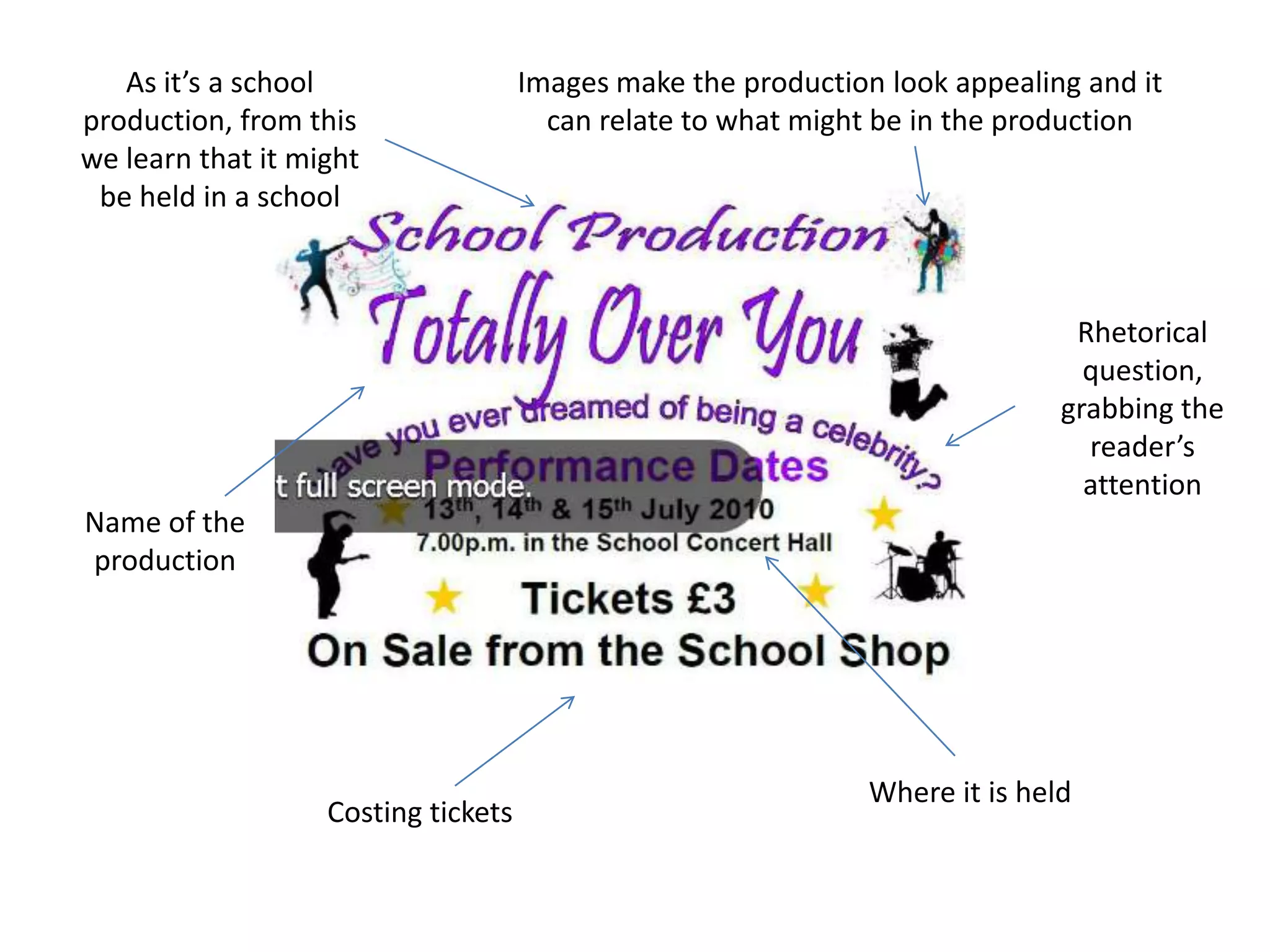 The document discusses an upcoming school production, providing key details such as the production's name, where it will be held (in the school), and that tickets will likely cost money. Images are included to make the production appealing and relate to what will be in the show.