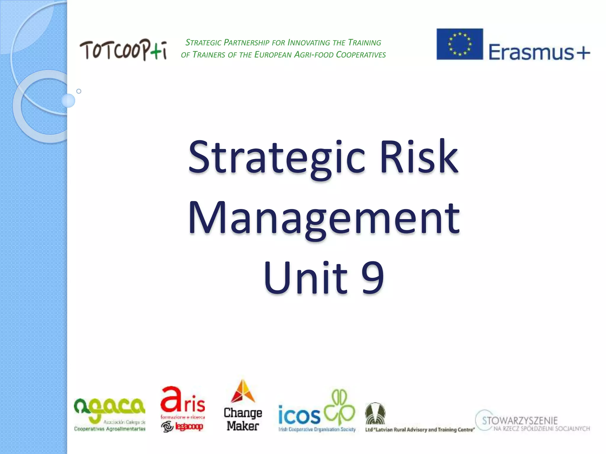 This document provides an overview of a training programme on strategic risk management. It includes an agenda that covers topics such as risk management principles, frameworks, governance, and specific business risks. The aims and objectives of the training are also outlined. Key aspects that will be taught include risk identification and assessment, risk analysis, risk culture, and implementing an effective risk management process. Various risk management models and frameworks are also highlighted such as the COSO enterprise risk management framework. The document provides information on the content to be delivered in the risk management training programme.