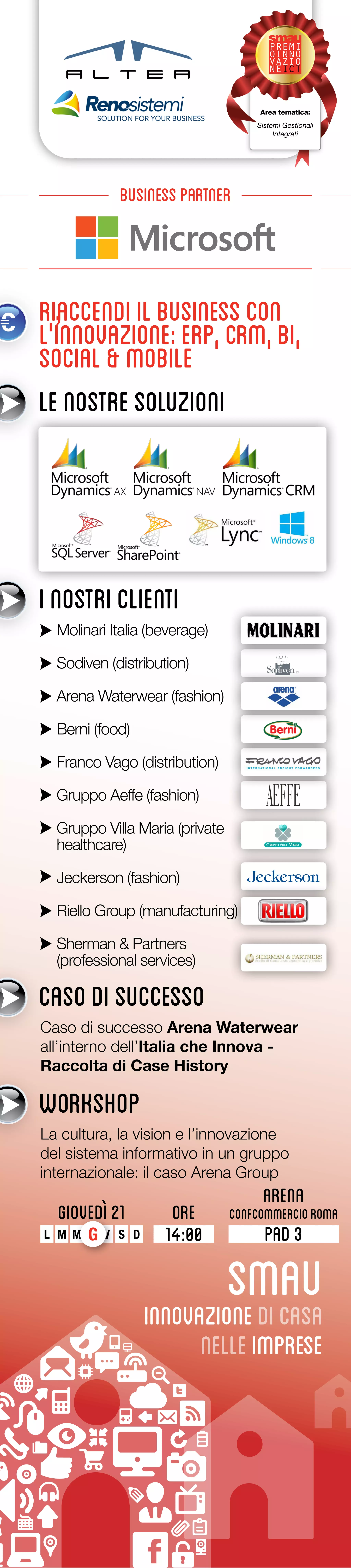 Il documento descrive come diverse aziende italiane, tra cui Arena Waterwear e Riello Group, stiano sfruttando l'innovazione tecnologica, attraverso ERP, CRM, Business Intelligence e mobile, per riaccendere il business. Viene presentato un caso di successo focalizzato su Arena Waterwear come esempio di innovazione all'interno del sistema informativo di un gruppo internazionale. L'evento si è svolto a Roma, evidenziando l'importanza della cultura e della visione imprenditoriale nel contesto delle nuove tecnologie.