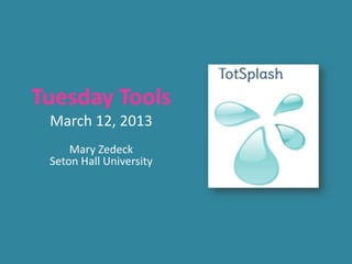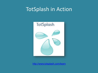 This document provides information about the TotSplash activity and website for creating interactive lessons and activities. It outlines the phases for using TotSplash, including logging in or getting started, taking a tour of the interface and features, and providing a workshop activity for experimenting with TotSplash. Contact information is provided for any questions.