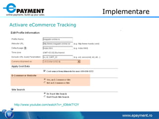 Documentul discută despre importanța implementării web analytics și tracking-ului e-commerce pentru a crește conversiile online. Utilizatorii pot monitoriza campaniile de marketing, performanța produselor și comportamentul clienților, identificând cuvintele cheie și canalele cele mai profitabile. De asemenea, se oferă sugestii pentru îmbunătățirea ratei de conversie și corectarea punctelor slabe ale site-ului.