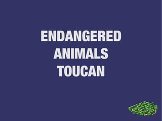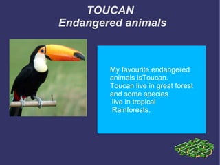 Toucans are brightly colored birds that live in the forests of Central and South America. They have large, colorful beaks and measure between 29-63 centimeters long. Toucans live in tropical rainforests and jungles from sea level to 3,200 meters in countries like Venezuela, Ecuador, and Colombia. They are threatened by habitat loss as forests are destroyed by humans and by being captured and sold as exotic pets. Laws have been introduced in some countries to protect toucans and prevent their capture and trade.