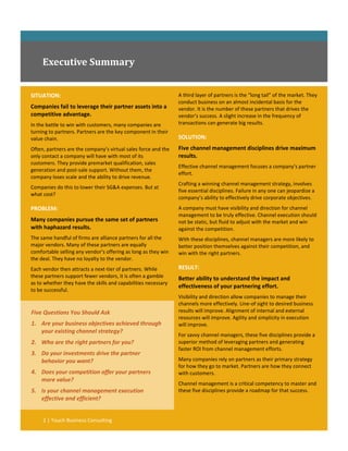 The document outlines five essential disciplines for effective channel management, emphasizing the importance of leveraging partner investments to gain a competitive advantage. It highlights the need for companies to strategically manage their partner ecosystems, articulate clear business propositions, and ensure alignment with corporate objectives to drive desired partner behaviors. By following these practices, organizations can enhance their channel performance, ultimately improving revenue and market positioning.