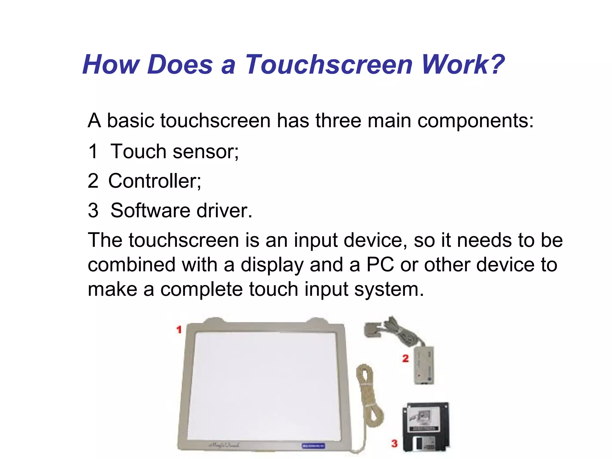 The document describes different types of touch screen technologies. It discusses how resistive, capacitive, infrared, surface acoustic wave (SAW), and projected capacitive touchscreens work. It explains that resistive touchscreens use electrically conductive and resistive layers separated by spacers, while capacitive and SAW touchscreens rely on changes in electrical fields when touched. The document provides brief summaries of each technology's characteristics.