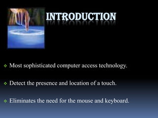 This document presents information about touch screen technology. It discusses the history and emergence of touch screens in the 1960s and 1970s. It then describes several touch screen technologies - surface acoustic wave, resistive, capacitive, infrared, strain gauge, optical imaging, and dispersive signal. It provides details on each technology and compares their durability, stability, touch capability, response time, and monitor options. The document also outlines the three main components of touch screens - the touch sensor, controller, and software driver. It concludes with examples of touch screen applications.