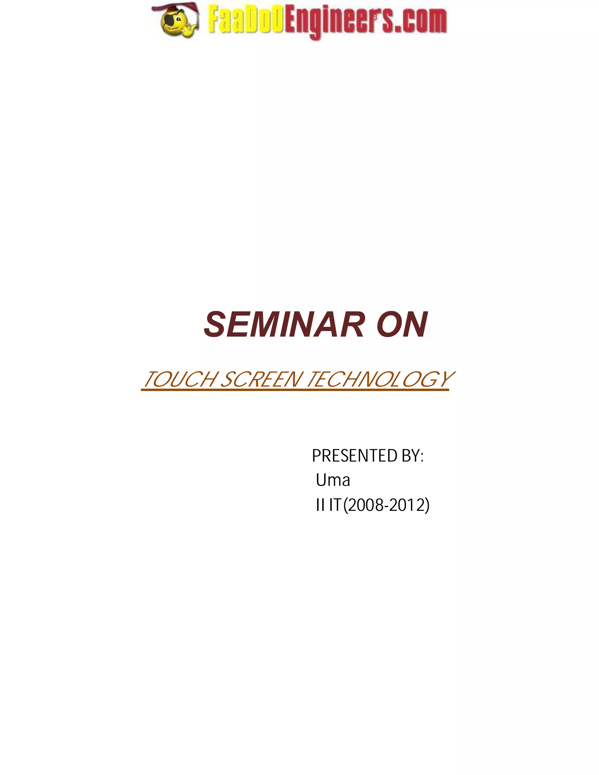 This document provides an overview of touch screen technology. It discusses the different types of touch screen technologies including resistive, surface, capacitive, surface capacitance, projected capacitance, infrared, strain gauge, and optical imaging. It covers the history of touch screens and how they have evolved from early research labs in the 1960s to become widely used in devices today. The document also discusses touch screen construction, development, ergonomics, and various technologies such as resistive, surface acoustic wave, capacitive, infrared, and optical imaging.
