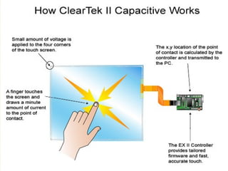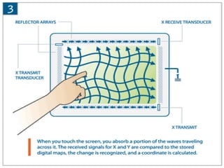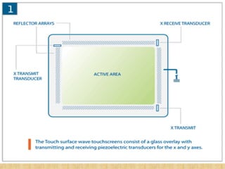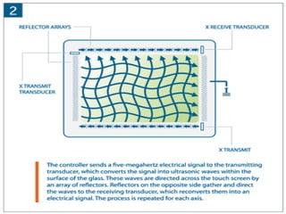 The document discusses the history and development of touch screen technology from its inception in 1971 to current applications, providing details on the different types of touch screen technologies including resistive, surface acoustic wave, capacitive, and infrared as well as describing the key components and manufacturers in the industry.