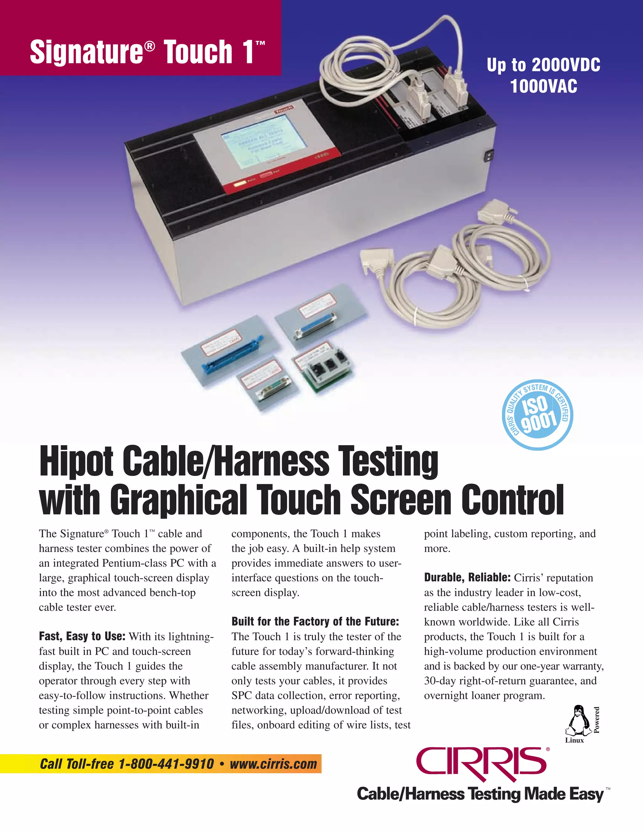 The Signature Touch 1 is an advanced cable and harness tester that combines a powerful integrated PC and large graphical touchscreen display. It features fast, easy-to-use software that guides operators through testing. The Touch 1 can test up to 2000VDC or 1000VAC and up to 1024 test points. It provides detailed results, custom reporting, and optional SPC data collection.