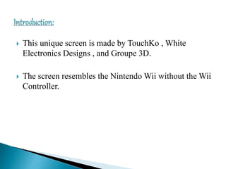 This document discusses touchless technology that allows users to interact with screens without physically touching them. It describes a touchless monitor developed by TouchKo, White Electronics Designs, and Groupe 3D that uses sensors around the screen to detect 3D motions and interpret them as on-screen interactions. The document also mentions several other touchless technologies like the Touchless SDK, Touch Wall, eye tracking devices, gesture recognition tools, and motion sensors that enable touchless control of devices.