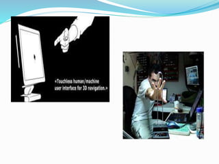 The document discusses touchless touch screen technology. It describes how touchless screens work using infrared sensors to detect hand motions from up to 5 feet away without any physical contact. Applications mentioned include controlling applications, video games like Minority Report, and drawing. Advantages are easier use, satisfying experience, and ability to control objects through gestures without drivers. The conclusion envisions future interfaces where the body itself could serve as an input device.