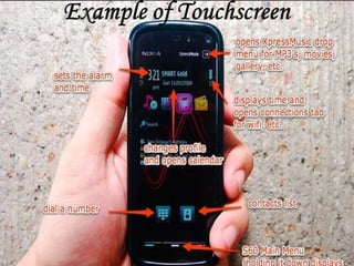 A touch screen consists of a clear glass panel with a touch-sensitive surface connected to a controller. The controller determines the type of interface needed and connects the touch screen to a PC. A driver software allows the touch screen and computer to communicate. There are different types of touch screen technologies including resistive, capacitive, surface acoustic wave, and infrared screens. Touch screens are used in public displays, customer self-service kiosks, and other applications where direct input is needed without keyboards or mice.