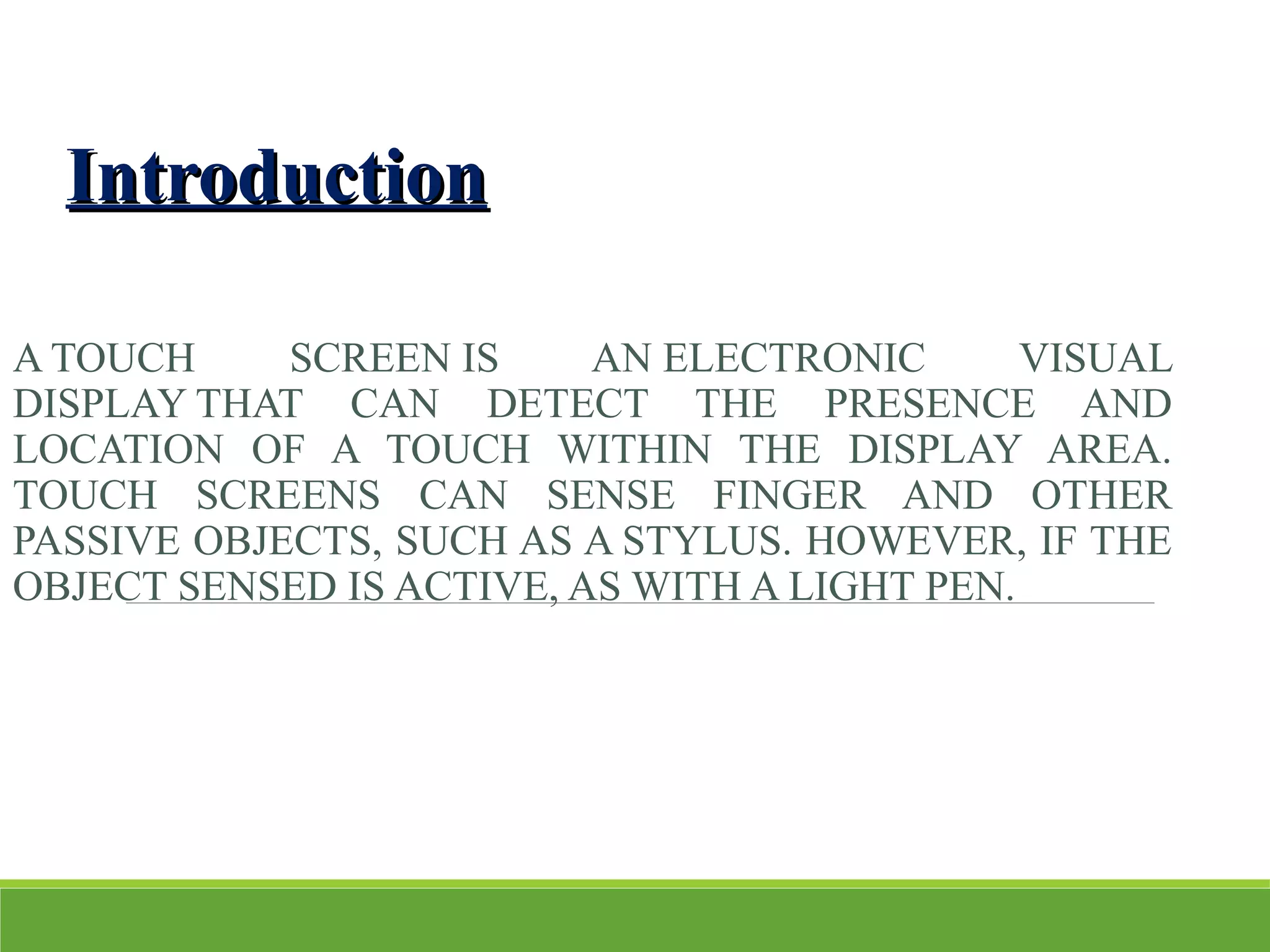 The document discusses the history and development of touchscreen technology. It describes Dr. Samuel Hurst inventing the first touch sensor called "Elograph" in 1971. It then discusses the four main types of touchscreen technologies - resistive, surface acoustic wave, capacitive, and infrared - providing details on how each works and their advantages and disadvantages. The document concludes that while touchscreens have some limitations, the technology is very user-friendly and has been widely accepted.