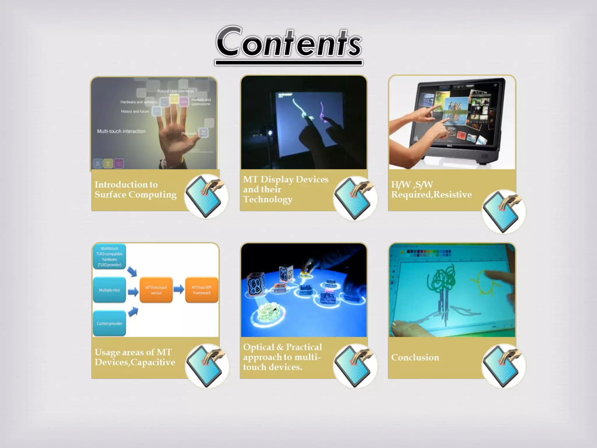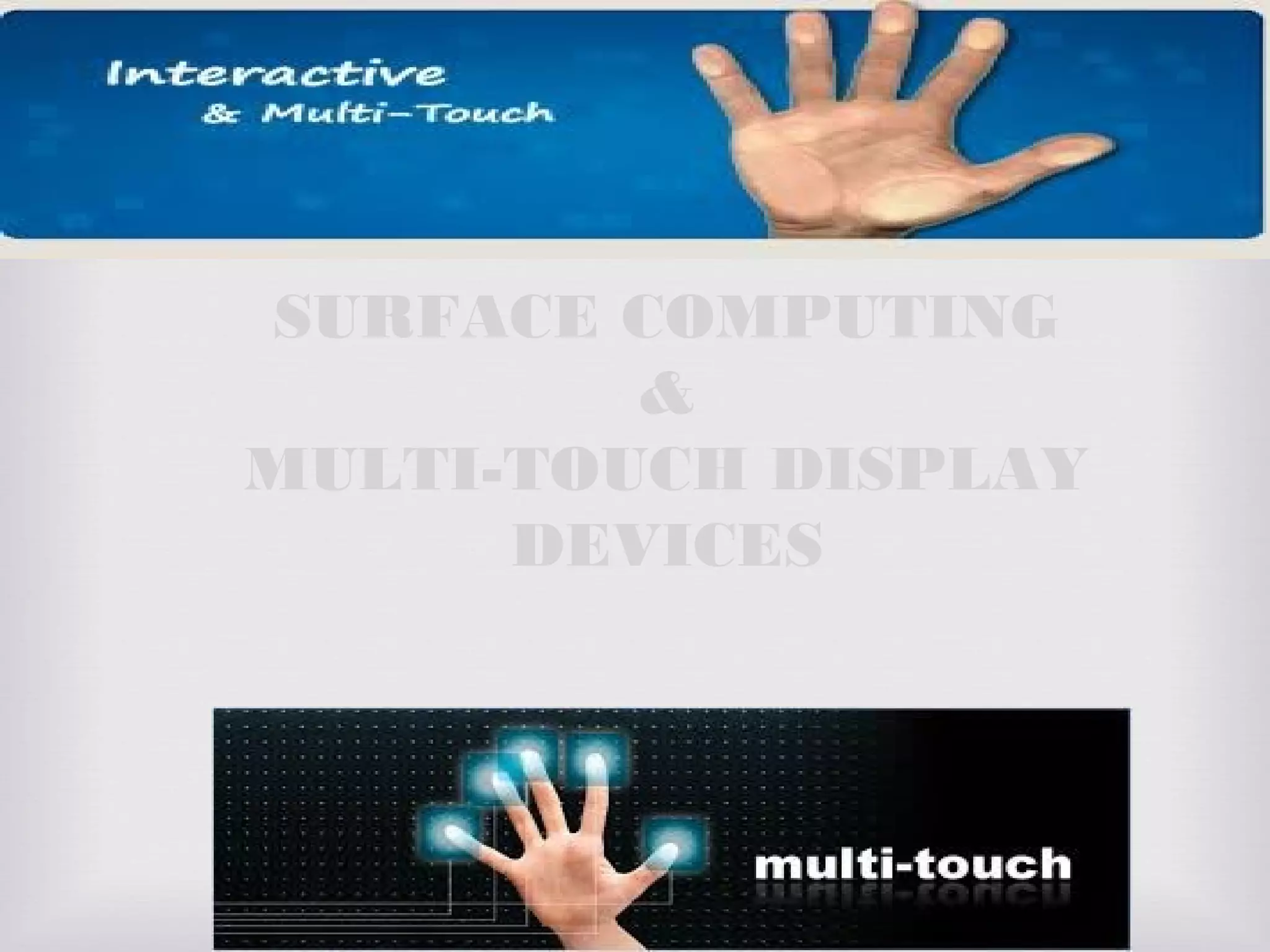 This document discusses surface computing and multi-touch display devices. Surface computing allows users to interact directly with a touch-sensitive screen instead of using a keyboard and mouse. Multi-touch devices allow multiple touches at once, serving as a substitute for traditional input devices. The document then describes various touchscreen technologies like resistive and capacitive, how they work, their advantages and disadvantages. It also covers implementation of gesture recognition software to interpret user inputs on touchscreens. Finally, potential applications of these technologies are mentioned.