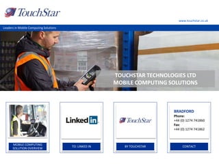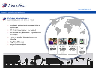 Touchstar Technologies Ltd specializes in mobile computing solutions, having over 30 years of industry experience and more than 100,000 installations globally. Their offerings include mobile data capture systems, mobile point of sale systems, and various technologies for warehouse logistics and fuel delivery. The company provides 24/7 UK-based support and focuses on delivering real-time data capture and communication solutions for clients worldwide.