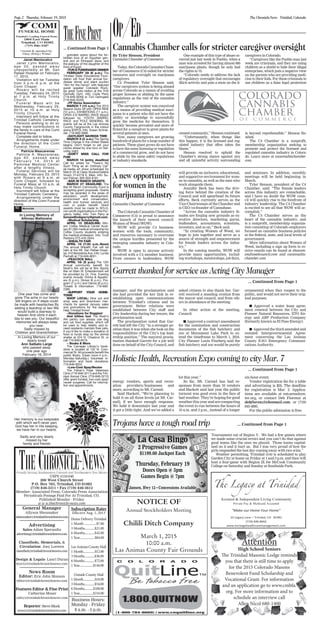 The document provides a schedule of local sports games and events for high schools, Trinidad State, and includes a calendar listing community events happening from February 19th to 28th, such as dine out events to support Noah's Ark Animal Shelter, Republican Women's dinner, and an opera performance of Aida. It also includes weather forecasts, river flow information, and brief news articles about a Valentine's adoption event at Big R and thanking the acting city manager for her service.