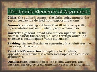 The document outlines the Toulmin model of argumentation, detailing its components: claim, grounds, warrant, backing, rebuttal, and qualification. It emphasizes the role of logical syllogism in constructing arguments, where every paragraph serves as a micro-argument supporting a main thesis through evidence and reasoning. Additionally, it discusses the importance of avoiding overgeneralizations and incorporating qualifiers and rebuttals to strengthen claims and enhance clarity in arguments.