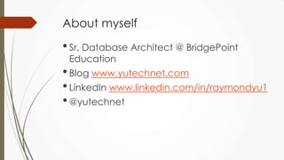 The document outlines a presentation on big data given by Raymond Yu, covering essential topics in data science such as MapReduce, NoSQL databases, and machine learning. It highlights the significance of data volume, velocity, and variety, as well as the methodologies for data extraction and analysis. The talk emphasizes modern tools and techniques used in big data management and visualization, illustrating their practical applications in areas like voter data analysis during political campaigns.