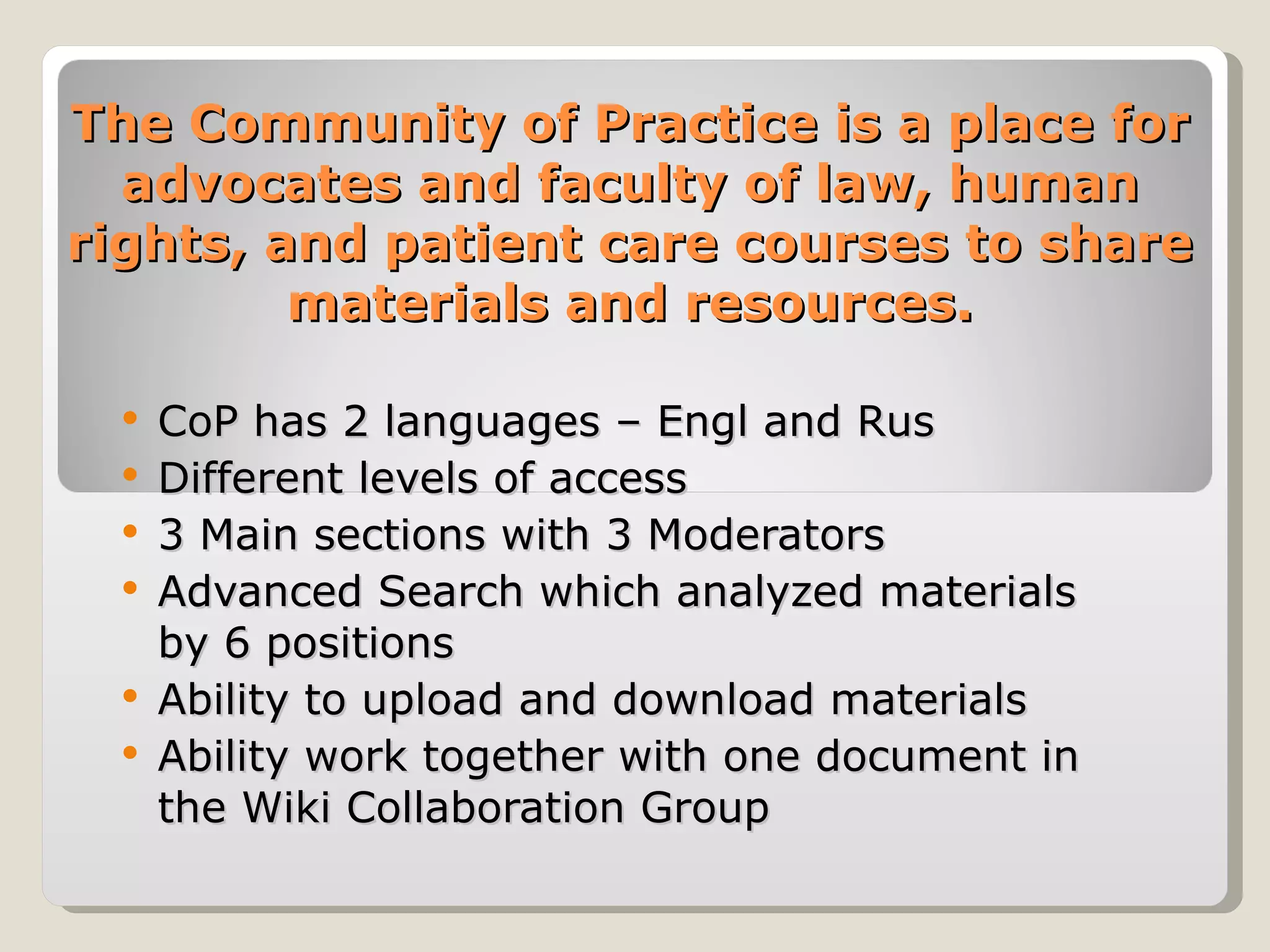 The Community of Practice (CoP) is a collaborative platform for advocates and faculty in law, human rights, and patient care to share resources, available in English and Russian. Members have access to various materials, can upload documents, participate in discussions, and utilize advanced search functions. To join, users must create a profile and await moderator approval to access all features and content.