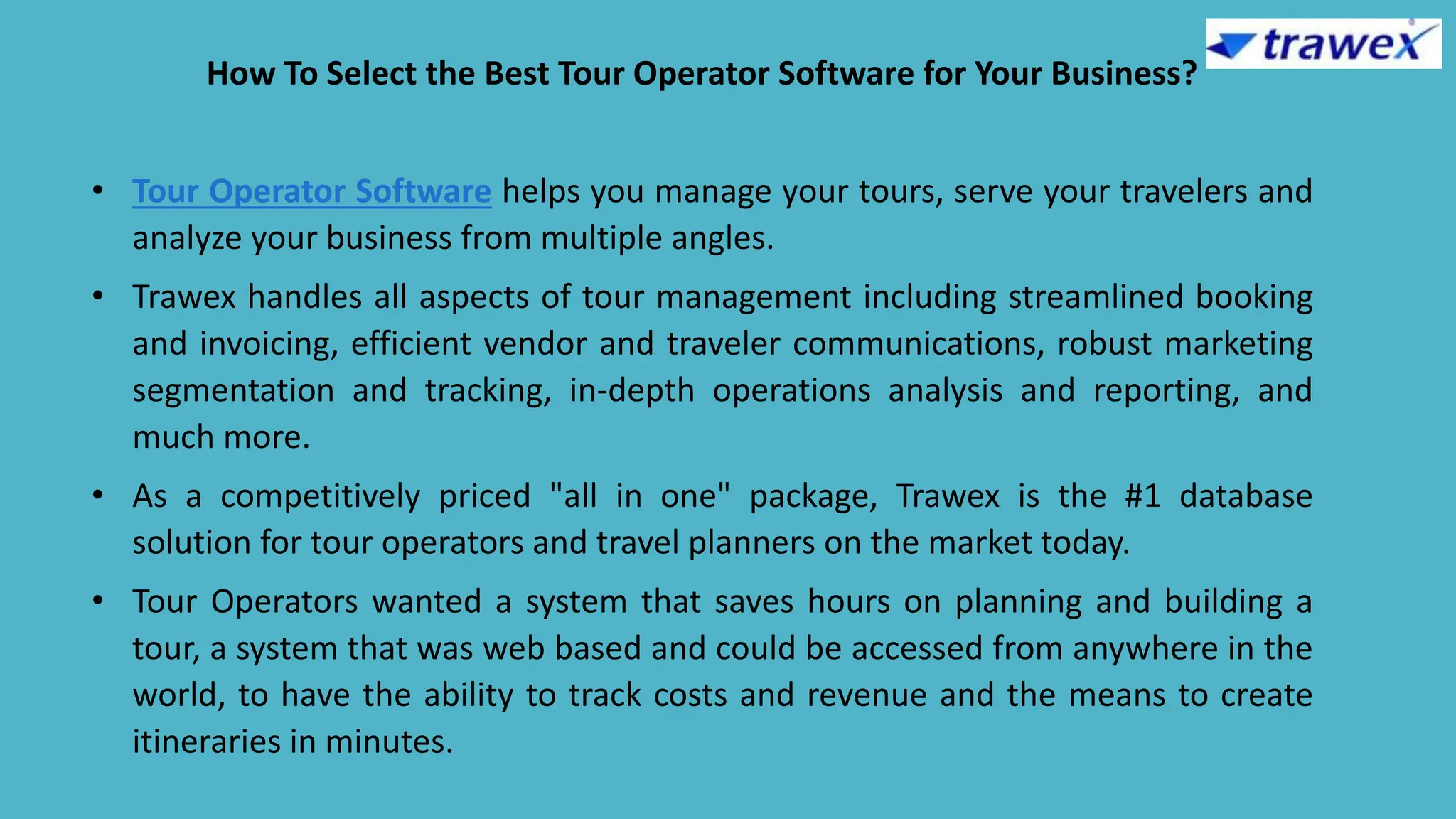 The document provides an overview of Trawex, a tour operator software designed to streamline management of tours, bookings, and communications for travel agencies. It highlights the software's features such as web-based access, inventory management, and integration with various booking engines, aiming to improve efficiency and increase sales for tour operators. Additionally, it outlines the essential role of tour operators in the tourism industry, including functions like bulk purchasing of travel products and contributing to domestic and outbound tourism.