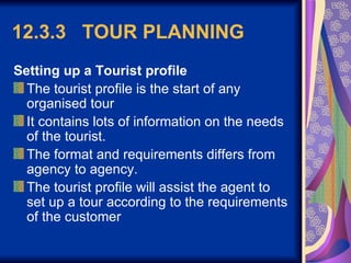 The document provides guidance on planning a tourist tour, including creating a tourist profile, researching attractions and activities, compiling a day-by-day timed itinerary, and developing a tour budget. A tourist profile contains information about a tourist's needs and interests to guide tour planning. An itinerary should list activities next to specific times in each day, take travel times into account, and include descriptions of attractions. A tour budget details the costs of accommodation, transportation, and other expenses to provide an overall tour cost.