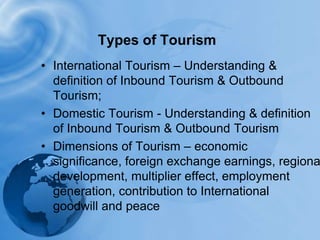 This document discusses different types of tourism and their economic impacts. It defines inbound and outbound tourism for both international and domestic tourism. It then explains some of tourism's key economic effects, including generating income through wages, taxes, and business profits; creating employment opportunities both directly and indirectly; stimulating a multiplier effect through re-spending of tourism dollars in the local economy; and contributing positively to a country's balance of payments by bringing in foreign currency from international visitors. It notes that tourism is a major income generator for many countries and regions.