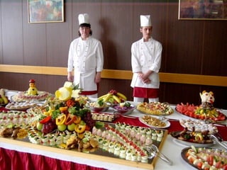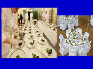 The document discusses different types of menus, including table d'hote menus which offer a fixed number of courses at a set price and time, and a la carte menus which allow more extensive choices with individually priced dishes that may have longer wait times. It also covers important considerations for menu composition, such as selecting harmonizing dishes across courses that appeal to both sight and taste, and factors to consider for menu planning like the type of establishment, season, and capabilities of kitchen staff.