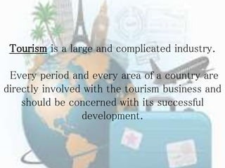 Tourism is a large and complex industry that involves every area of a country. The goals of tourism development are to raise living standards through economic benefits, develop infrastructure for tourists and residents, and establish suitable development within tourist centers. However, tourism development faces several hindrances related to lack of transportation, accommodations, financing, and trained personnel. Political aspects like land use zoning, infrastructure construction and maintenance, and promotional programs also impact tourism development.