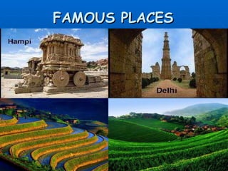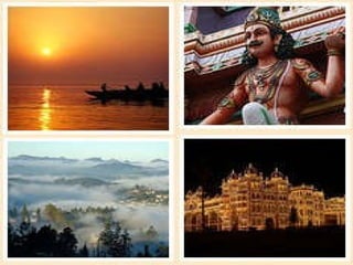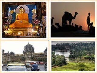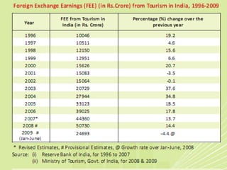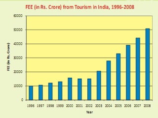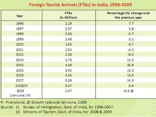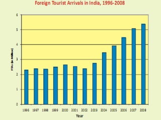 The document discusses India's tourism industry, including top destinations for foreign and domestic tourists. It analyzes the industry's strengths as a country with rich heritage and culture, weaknesses like inadequate infrastructure and accommodation, opportunities from events like the Commonwealth Games, and threats from issues like terrorism, crime and disease. It also outlines the "Athiti Devo Bhavah" initiative to improve treatment of foreign tourists and sensitize industry stakeholders through training.