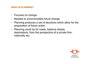 This document provides an overview of tourism planning. It discusses what planning is, focusing on accommodating future change. Comprehensive planning considers all tourism resources, organizations, markets, and programs within a region, as well as economic, environmental, social, and institutional aspects. The tourism planning process involves issue definition, policy formulation, implementation, and redefinition. Tourism is changing rapidly and can economically and culturally boost or detrimentally impact societies and environments. Government plays a role in regulating competition, providing infrastructure, and maximizing domestic tourism opportunities while encouraging foreign exchange through inbound tourism. Both positive and negative political, economic, social, technological, environmental, and employment impacts of tourism are covered. The significance of tourism as a global industry