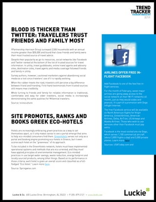 This is the February 2011 edition of the Luckie & Company produced Tourism Trend Tracker newsletter. It is a quick topical snapshot of general trends, social media and traditional advertising in the Tourism marketplace for February. For more information or back issues, visit www.luckie.com