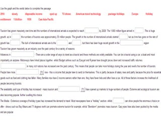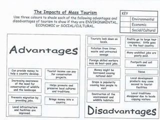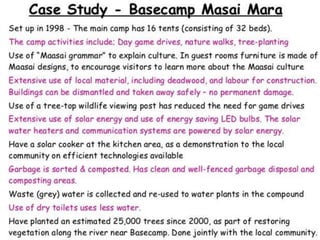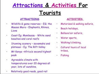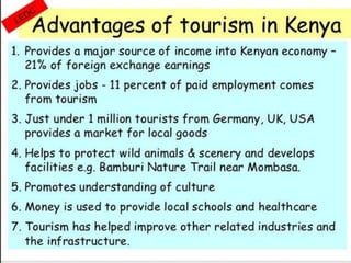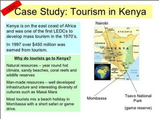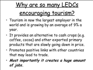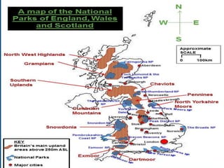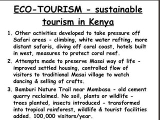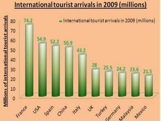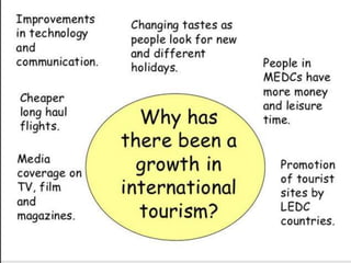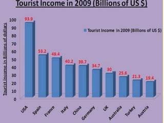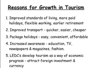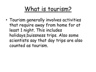 Tourism has grown massively over the past century due to advances in transportation technology, increased leisure time and income, and greater variety in vacation options. National parks are important tourist destinations that provide recreational and economic benefits but also face challenges from heavy traffic and environmental pressures at popular "honey pot" sites. Effective management is needed to balance visitor access with conservation goals.