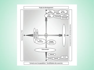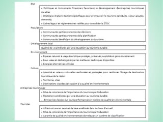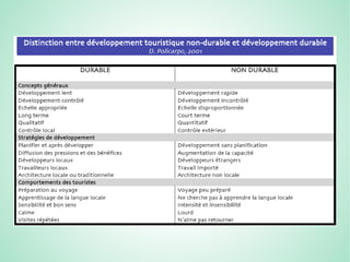 Le document aborde les impacts du tourisme, tant positifs que négatifs, en soulignant les enjeux environnementaux, sociaux et économiques associés à cette industrie. Il critique le tourisme traditionnel pour ses fuites de revenus et ses conséquences néfastes sur les cultures locales, tout en présentant des alternatives comme le tourisme responsable et solidaire, qui cherchent à favoriser un développement durable. En conclusion, il appelle à une réflexion sur la manière dont le tourisme peut être réformé pour mieux respecter les populations locales et l'environnement.