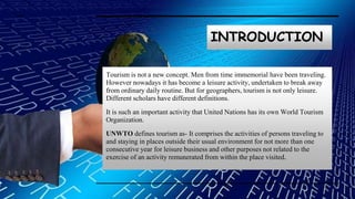 Tourism is an important activity that involves travel for leisure or business purposes. The document discusses different types of tourism in India including cultural, pilgrimage, and medical tourism. It provides details on attractions, government policies and initiatives to promote various forms of tourism. Challenges faced by the tourism sector such as infrastructure and safety issues are also highlighted. Overall, tourism is a major contributor to India's economy and employment if ongoing efforts continue to enhance it.